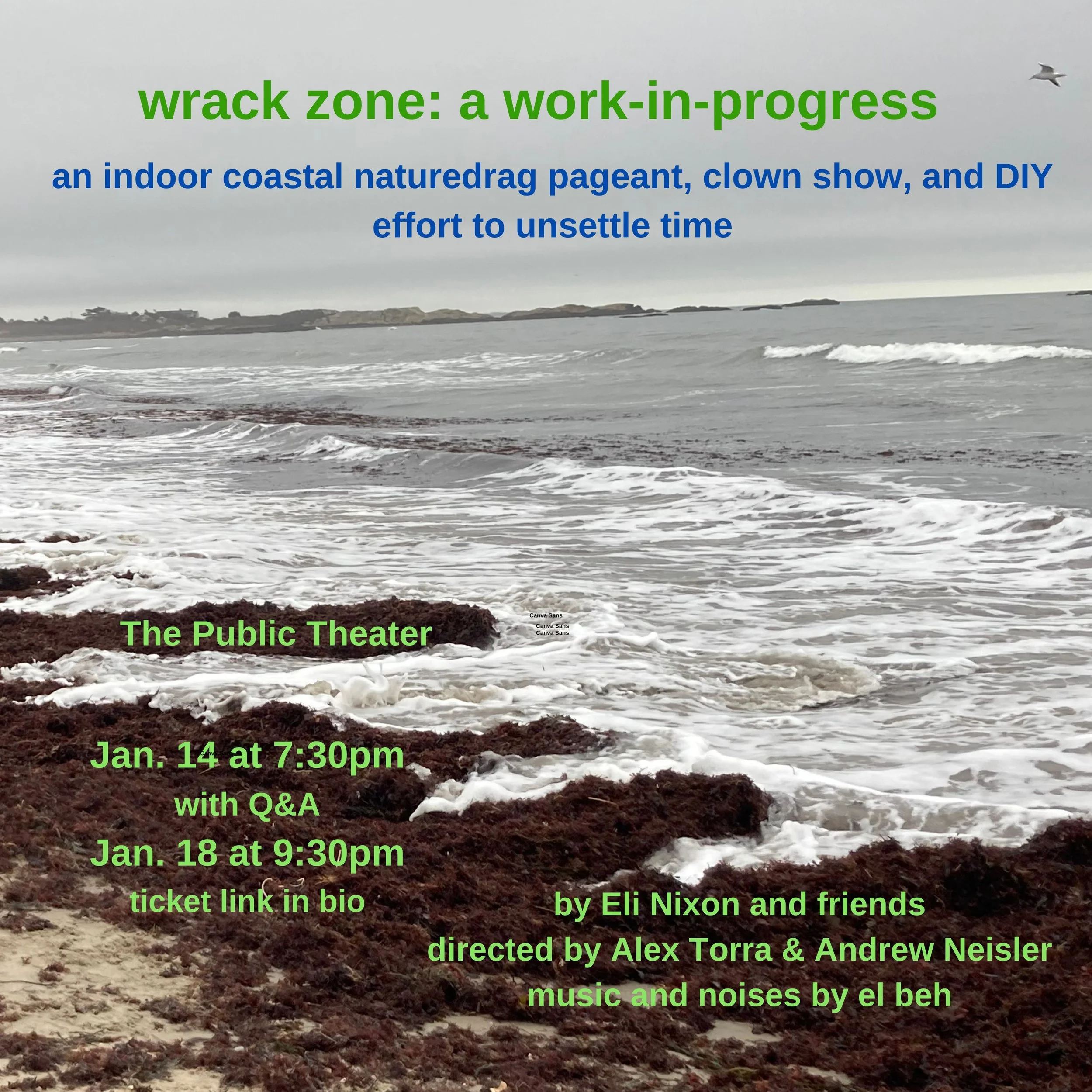 Much like our coastline itself ‘wrack zone’ continues to shift and reveal itself. I’ve enjoyed opportunities to research and play with its ideas and languages through residencies with Mercury Store, Fresh Ground Pepper’s Ecoweek, and Mauricio Salgado’s Theater Research & Climate Action class at NYC. In January of 2024, with an ensemble of 9 performers, accompanied by cellist el beh, I shared a work-in-progress of ‘wrack zone’ at NYC’s Public Theater as part of my participation in their Devised Theater Working Group. In May of 2024, we shared a 3 person version of ‘wrack zone’ at Ars Nova in NYC. el beh was on cello and sound effects, Patrick Costello animated my drawings and other overhead projections, and the audience and I played everyone else (crowd participation included DIY volcanic eruptions and other events of the last 5 billion years.)